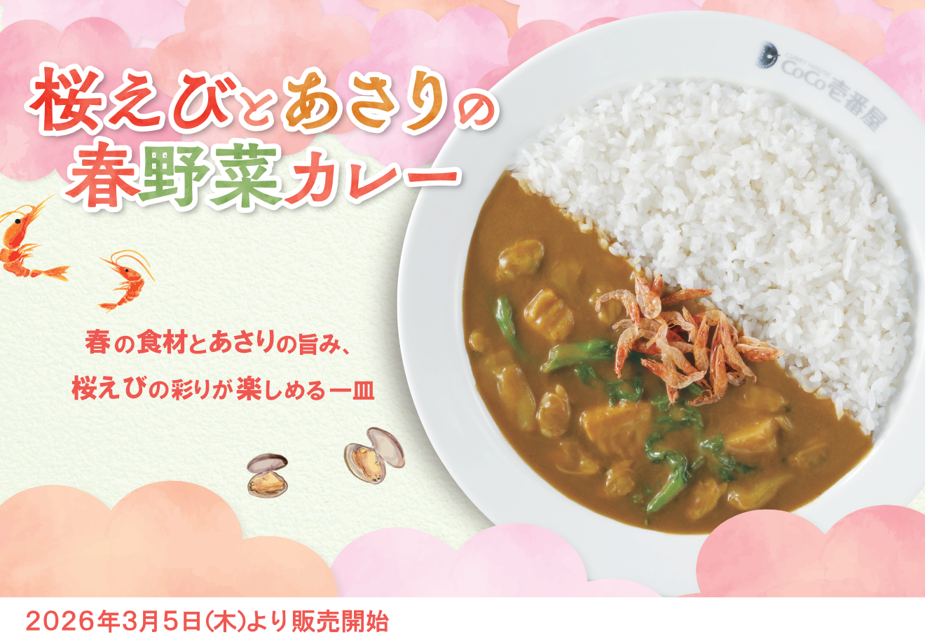 - 2026年03月02日商品情報ココイチに春を感じる限定メニューが登場!「桜えびとあさりの春野菜カレー」を3月5日より数量限定で販売 -同日より「手仕込ささみカツカレー」「わさびタルタル」も期間・数量限定で販売-