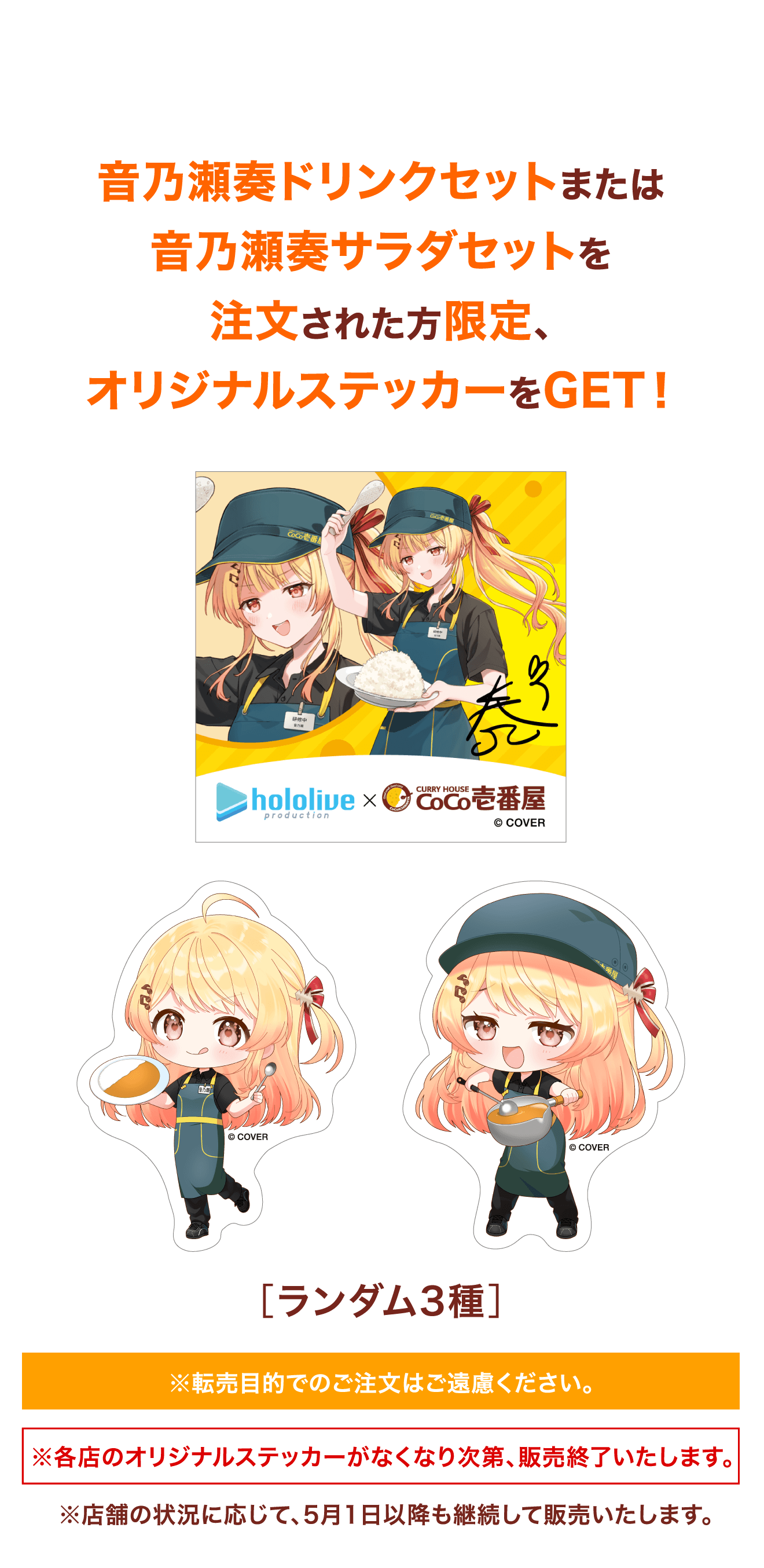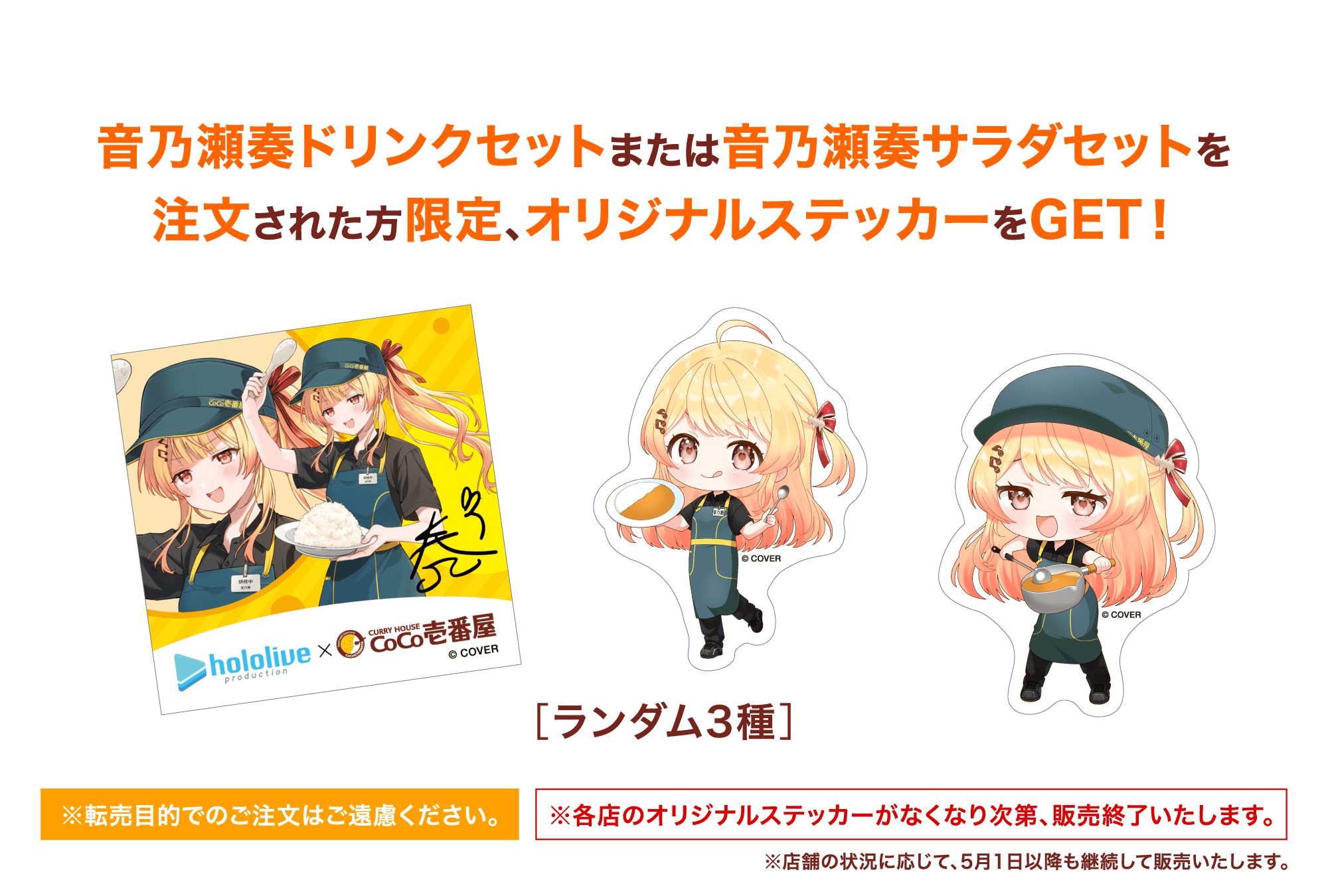 キャンペーン期間中に、音乃瀬奏ドリンクセットまたは音乃瀬奏サラダセットをご注文ください。※各店オリジナルステッカーがなくなり次第終了いたします。※カレー1食につき、ドリンクセットまたはサラダセットどちらか1セット注文可能です。※カレーソースのみのご注文は対象外です。