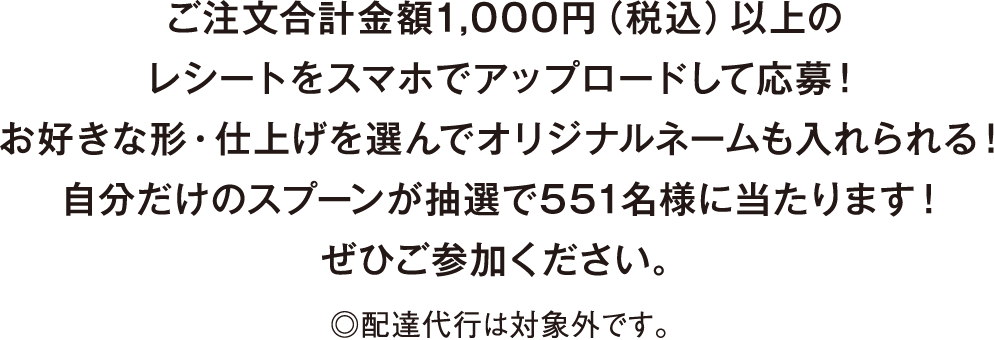 カレーハウスCoCo壱番屋で、キャンペーン期間中、ご注文合計金額1,000円(税込)以上のレシートをスマホでアップロードして応募すると抽選で551名様に、形・仕上げを選んでオリジナルネームが入る自分だけのスプーンが当たります。