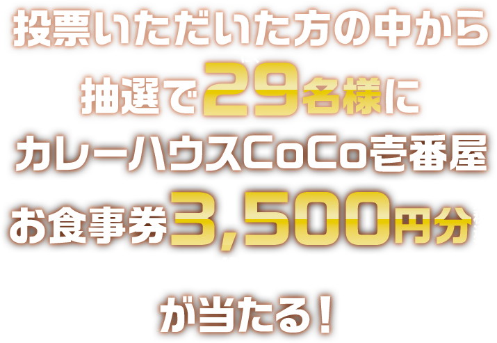 期間中に応募された応募者のうち、抽選で29名様にカレーハウスCoCo壱番屋 お食事券3,500円分(税込)をプレゼントいたします。